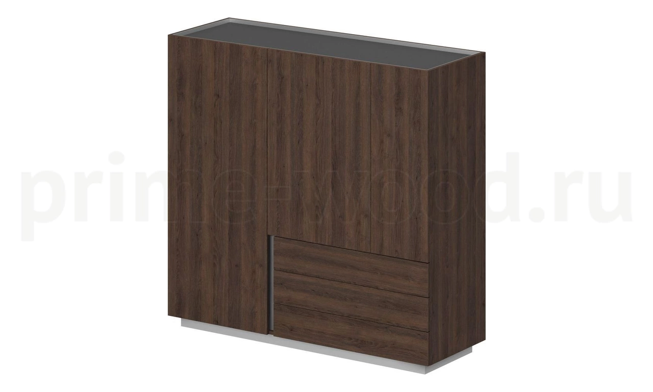 Шкаф на регулируемых опорах с 3-мя ящиками и 2-мя распашными фасадами. Шкаф имеет ориентацию - правый и левый. В секции за широким высоким распашным фасадом - выдвижная штанга (премиум сигмент). В этой же секции есть присадка для установки трёх дополнительных полок (опционально). В шкафу присутствует присадка для установки трёх дополнительных полок (опционально). Комплект из 3-х полок заказывается отдельно. В секции за низкими распашными фасадами по две полки.